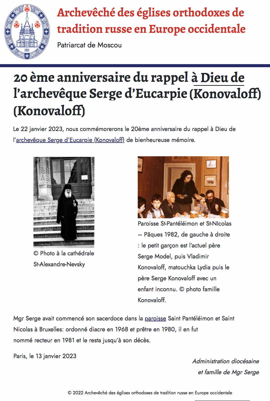 | | Higoumène Prokhor | Ainsi le Père Prokhor assure la célébration des offices depuis plus de 25 ans et se tient spirituellement au service des paroissiens à « la Tourelle », église bientôt centenaire située rue De Mot 47 à Etterbeek (Bruxelles 1040). Cette petite paroisse menacée d'expulsion continue à lutter contre des convoitises et fait appel à tous les chrétiens orthodoxes de l'aider à surmonter les attaques. Pour pouvoir continuer à célébrer leurs offices en leur lieu, une astreinte de 100€/jour leur est réclamée. Une partie de cette somme leur a déjà été offerte, mais ils sont encore loin de la totalité. Même modestes, tous vos dons d'où qu'ils viennent - et c'est urgent - seront vraiment très précieux. Bénéficiaire : Paroisse Saints Pantéleimon et Nicolas | Compte IBAN : BE04 0017 3167 6231 | BIC : GEBABEBB | Note : cliquez sur les photos et/ou les liens-textes pour plus de détails. Lien-adresse du présent message : http://www.vava.be/Mail/RC_Mailing_January_13,_2023.html |