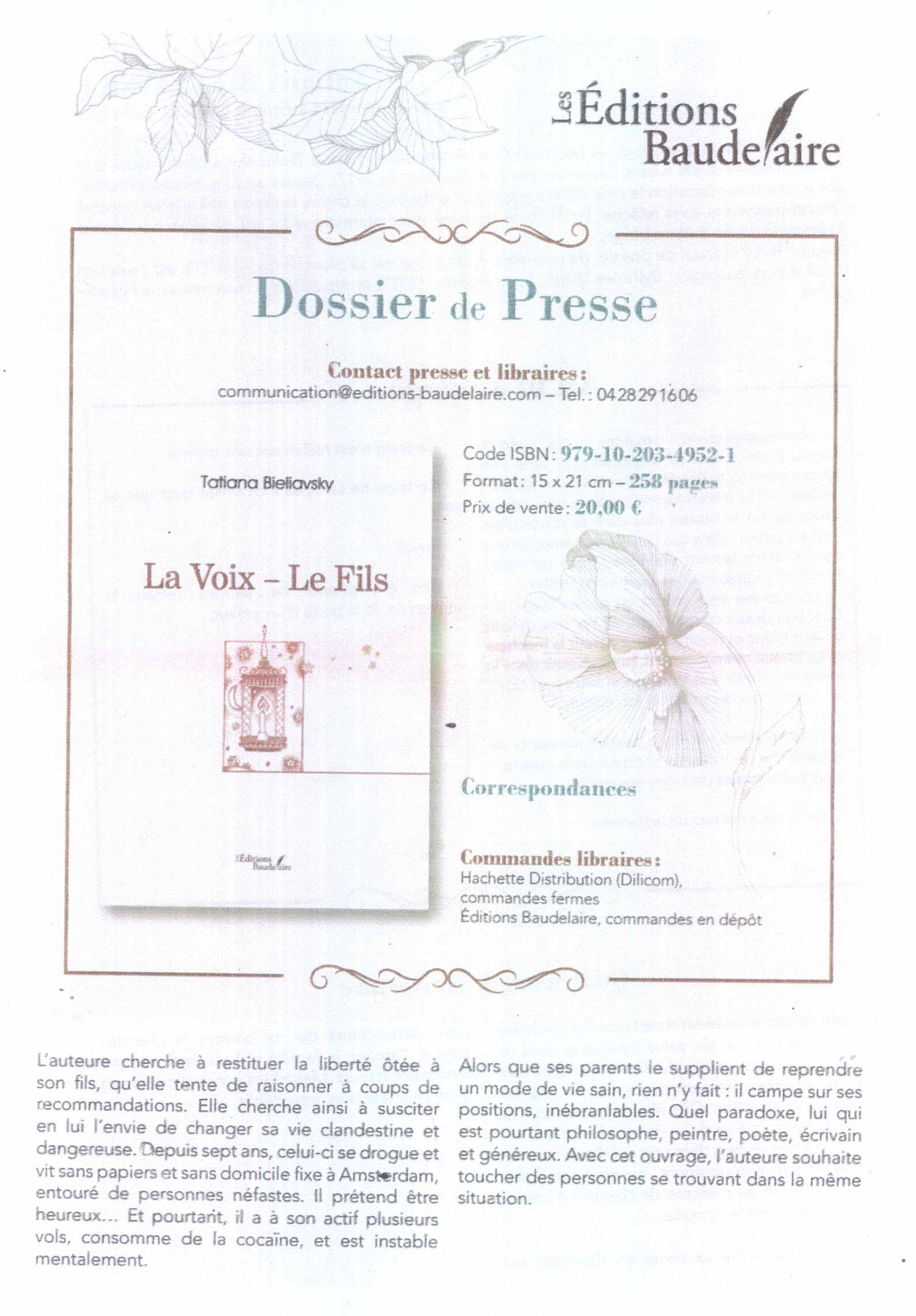 Tatiana Bieliavsky => La Voix – Le Fils aux Éditions Baudelaire. |  La Voix – Le Fils Dossier de presse page 1. |
