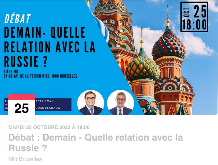 par Timur Michelashvili Les Jeunes MR Ixelles ont le plaisir de vous inviter pour un débat sur notre future relation avec la Russie ! L'introduction au débat sera faite par Gaëtan Van Goidsenhoven, député bruxellois et chef de file du MR Anderlecht. Nous avons également l'honneur d'avoir comme expert Jean Jacques Flahaux, expert en géopolitique et relations internationales et conseiller communale à Braine-le-Compte. Le débat sera articulé sur trois axes : 1) Traitement des questions humanitaires telles que : Comment devons-nous inclure les personnes fuyants le pouvoir russe et la mobilisation ? Si nous devons le faire et si le régime change, devons-nous continuer la guerre ? 2) Economique : Discussion des dépendances que nous avons par rapport à la Russie, au plan énergétique, alimentaire, etc.. 3) Traitement de questions politiques telles que : Quelles relations ou échanges devons-nous avoir avec des pays qui ne respectent pas les droits fondamentaux et comment agir dans ce genre de situation ? Nous vous attendons avec impatience !
