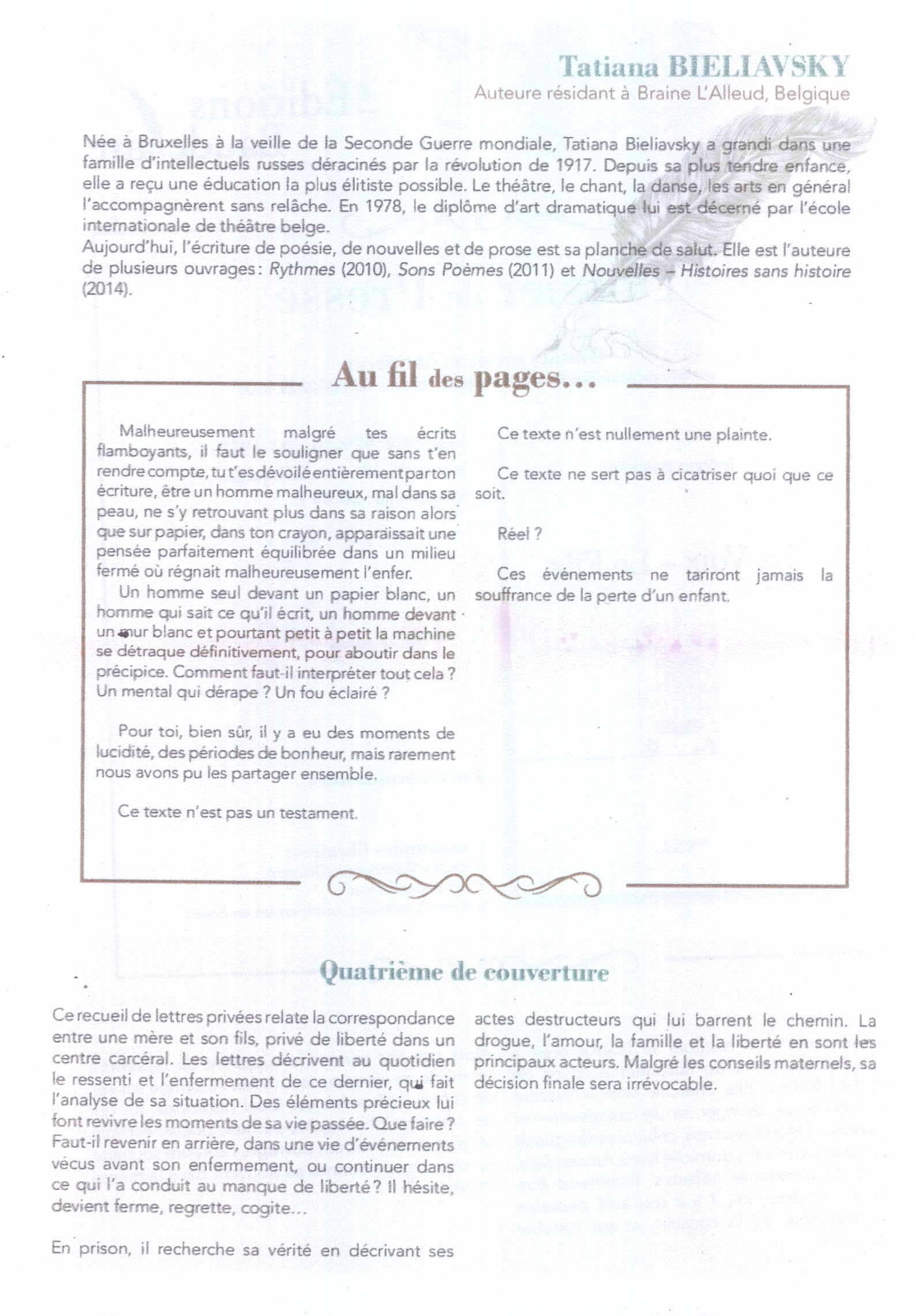 par Tatiana Bieliavsky, auteure résidant à Braine L'Alleud, Belgique Quatrième de couverture : Ce recueil de lettres privées relate la correspondance entre une mère et son fils, privé de liberté dans un centre carcéral. Les lettres décrivent au quotidien le ressenti et l'enfermement de ce dernier, qui fait l'analyse de sa situation. Des éléments précieux lui font revivre les moments de sa vie passée. Que faire ? Faut-il revenir en arrière, dans une vie d'événements vécus avant son enfermement, ou continuer dans ce qui l'a conduit au manque de liberté ? Il hésite, devient ferme, regrette, cogite... En prison, il recherche sa vérité en décrivant ses actes destructeurs qui lui barrent le chemin. La drogue, l'amour, la famille et la liberté en sont les principaux acteurs. Malgré les conseils maternels, sa décision finale sera irrévocable.
