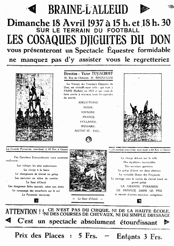 Direction Victor Teviachoff, rue de l'Athenée 30, Bruxelles ne manquez pas d'y assister, vous le regretteriez. Attention! ce n'est pas du cirque, ni de la haute école, ni des courses de chevaux, ni du simple dressag. C'est un spectacle étourdissant La troupe des Cosaques Djiguites du Don est véritablement celle qui était à Paris (Buffalo) en 1925 et qui vient de faire courrir à nouveau toutes les capitales du monde. Ces cavaliers Extraordinaires vous montrent réellement : Les voltiges les plus audacieuses, La charge à la lance, Le changement de cheval au galop, Les exercices au sabre de combat, Le saut d'Oural, Les dangereux Salto mortale, sabre aux dents, Le ramassage des mouchoirs sur le sol, La Pyramide renversée, marchant à 60 Km à l'heure, La charge debout sur la selle, Des équilibres incroyables, Des exercices guerriers, Le galop debout sur deux chevaux, La véritable danse des poignards, Le passage sous le ventre du cheval lancé au grand galop, La Grande Pyramide, marchant à 60 Km à l'heure, Le passage dans le feu, et encore d'autres exercices vertigineux.