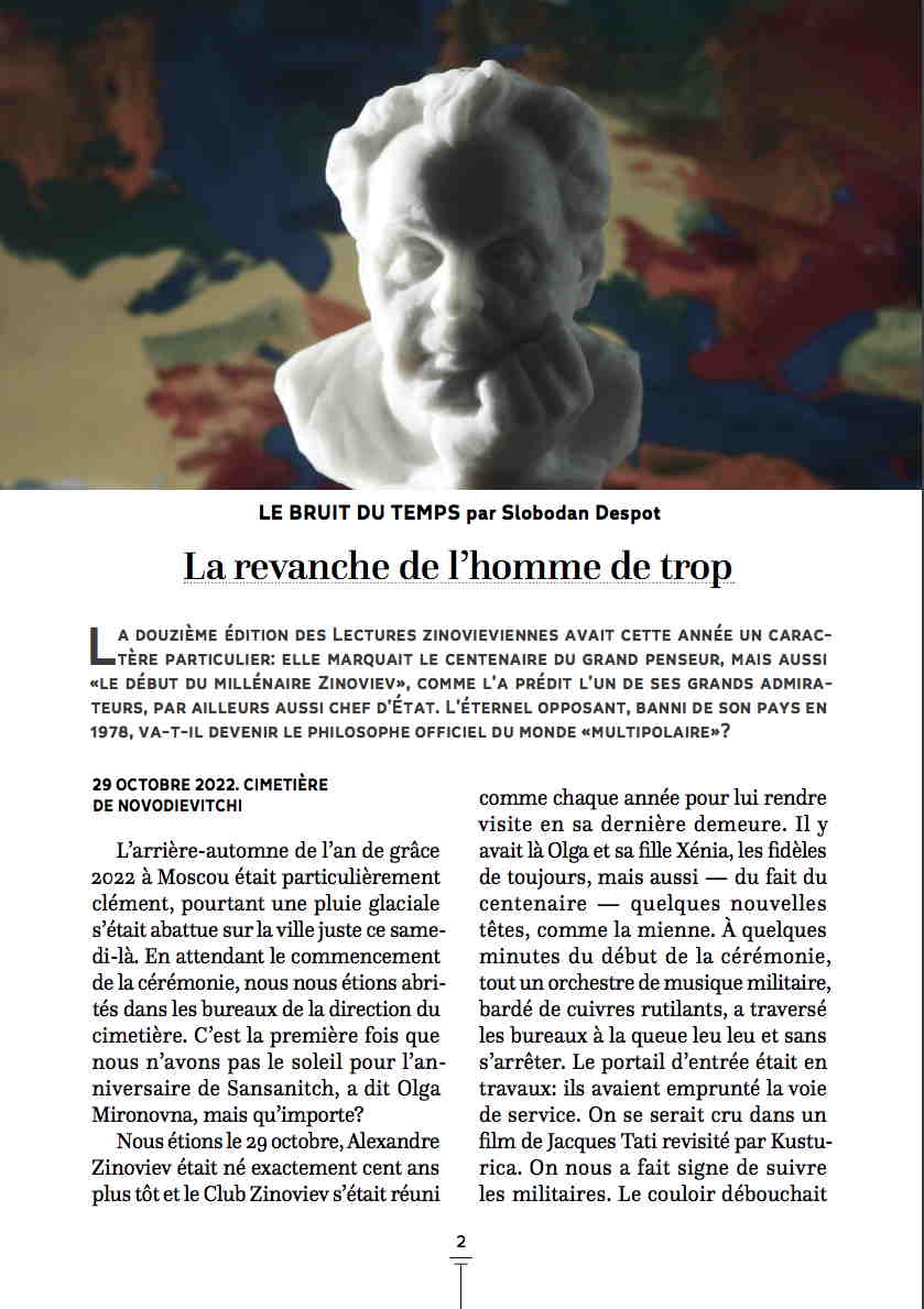 Est-ce le siècle Zinoviev qui s’achève ou le millénaire Zinoviev qui commence? Esquisse de réponse dans le reportage de Slobodan Despot sur la conférence du centenaire à Moscou. La douzième édition des Lectures zinovieviennes avait cette année un caractère particulier : elle marquait le centenaire du grand penseur, mais aussi «le début du millénaire Zinoviev», comme l’a prédit l’un de ses grands admirateurs, par ailleurs aussi chef d’État. L’éternel opposant, banni de son pays en 1978, va-t-il devenir le philosophe officiel du monde «multipolaire»? La revanche de l’homme de trop reportage publié dans Antipresse, LE BRUIT DU TEMPS № 364 - 20.11.2022 - pages 2-7 Titres : 29 octobre 2022. Cimetière de Novodievitchi 29 novembre 2022. Arbat 29 octobre 2022. Un message d’anniversaire un peu particulier 31 octobre 2022. Lectures zinovieviennes Illustration : Purnima Anand et JTMV devant les tableaux de Zinoviev. CODA
