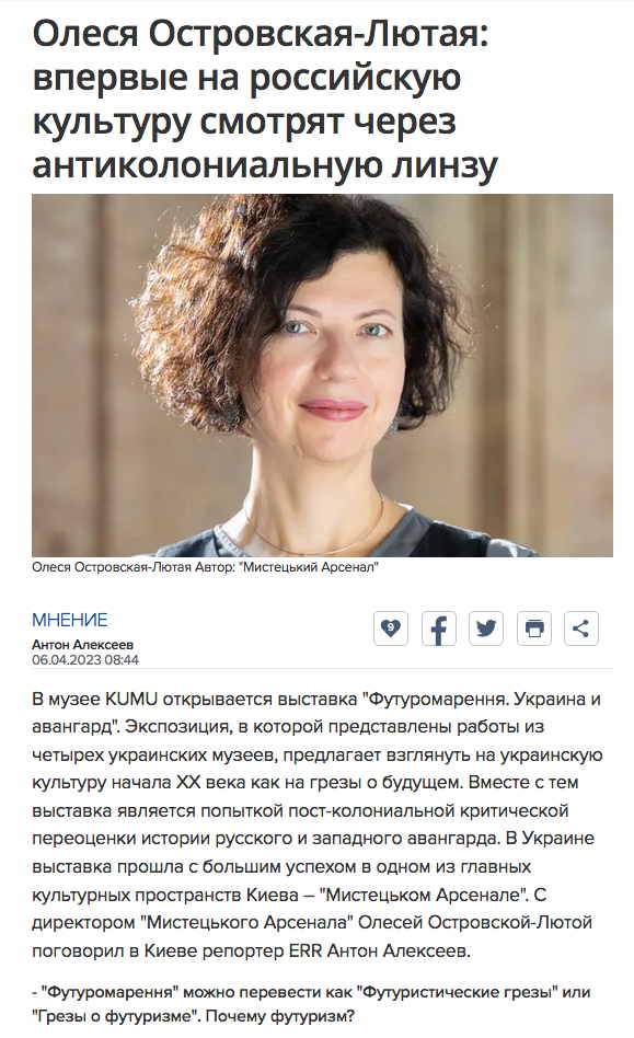 par Olesia Ostrovska-Liuta. Propos recueillis par Anton Alekseev. Traduit du russe par Clarisse Brossard. Pendant la guerre, la culture devient un champ de bataille. Dans cet entretien accordé au service russophone de la Radio-télévision publique estonienne (ERR), Olesia Ostrovska-Liuta, la directrice du centre national ukrainien d’art et de culture Mystetsky Arsenal, porte un regard postcolonial sur l’héritage artistique russe. Il s’agit notamment de la question très controversée de l’appartenance de certains artistes à la culture nationale russe ou ukrainienne. Questions : Quelle place occupe le futurisme dans la culture ukrainienne ? En tant qu’acteurs du monde de la culture, comment travaillez-vous en temps de guerre ? Depuis le début de la guerre totale, y a-t-il des expositions à Kyïv ? Le public est-il au rendez-vous ? • • • • • • •