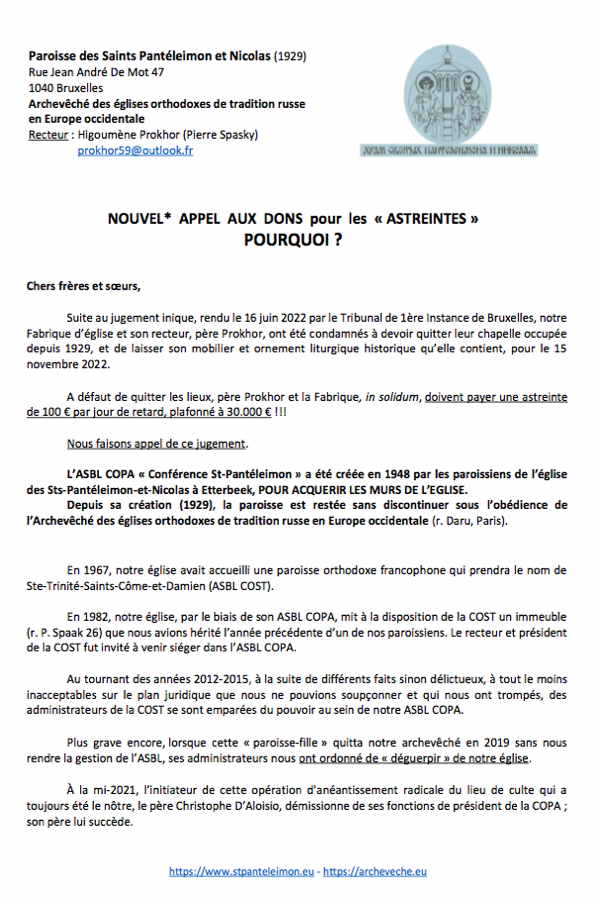 Higoumène Prokhor Paroisse Orthodoxe Saint Panteleimon et Saint Nicolas à Bruxelles (1929) Joyeuses Pâques! Mesdames et Messieurs les Présidents des associations russes, chers amis, Grâce à notre appel aux dons lancé en octobre 2022 pour garantir le maintien de notre paroisse historique dans ses murs, nous avons pu faire face à cinq mois d’astreintes d’occupations et nous vous en remercions du fond du coeur. Si nous avons eu le bonheur de recevoir votre soutien financier, nous n’avons pas encore pû rassembler la somme complète. Nous devons absolument pouvoir tenir jusqu’au 11 septembre de cette année. Après cette date nous pourrons attendre sereinement le jugement d’appel qui n’aura pas lieu avant deux-trois ans selon l’encombrement des cours et tribunaux. Comme pour le premier appel aux dons, vous trouverez le texte de l’appel sur le site de notre paroisse. Le texte sous format .pdf, écrit dans les deux langues est mis en pièce-jointe, il a la particularité d’exposer une très brève historique de notre paroisse fondatrice de la SPRL COPA et la description de ce que ses administrateurs actuels nous réclament auprès du tribunal. Mesdames et Messieurs les Présidents d’associations, c’est avec beaucoup d’espoir que je m’adresse encore à vous pour vous demander de diffuser parmi vos membres le présent deuxième appel, nous avons encore beaucoup besoin de vos soutiens et prières … Que le Seigneur vous bénisse et vous ait en Sa sainte garde ! Higoumène Prokhor, Recteur de la paroisse des saints Pantéleimon et Nicolas à Bruxelles Le dossier en détails