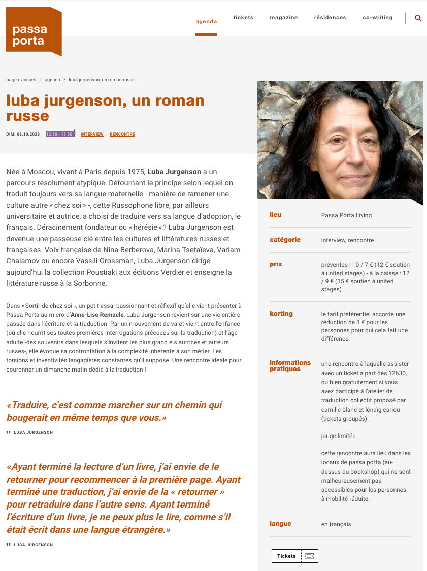 RC BIB page Internet. Passa Porta. interview, rencontre. Luba Jurgenson, un roman russe. 2023-10-08.jpg