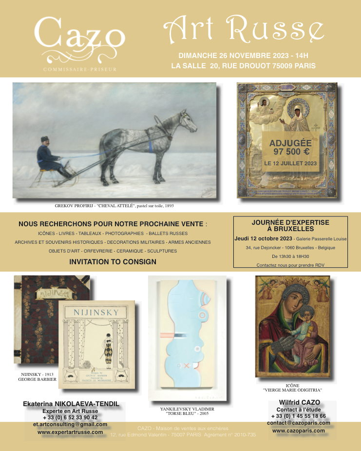 Contactez nous pour prendre rendez-vous : • Ekaterina Nikolaeva-Tendil, Experte en Art Russe / + 33 (0) 6 52 33 90 42 / et.artconsulting at gmail.com • Wilfrid Cazo Contact à l'étude / + 33 (0) 1 45 55 18 66 / contact at cazoparis.com