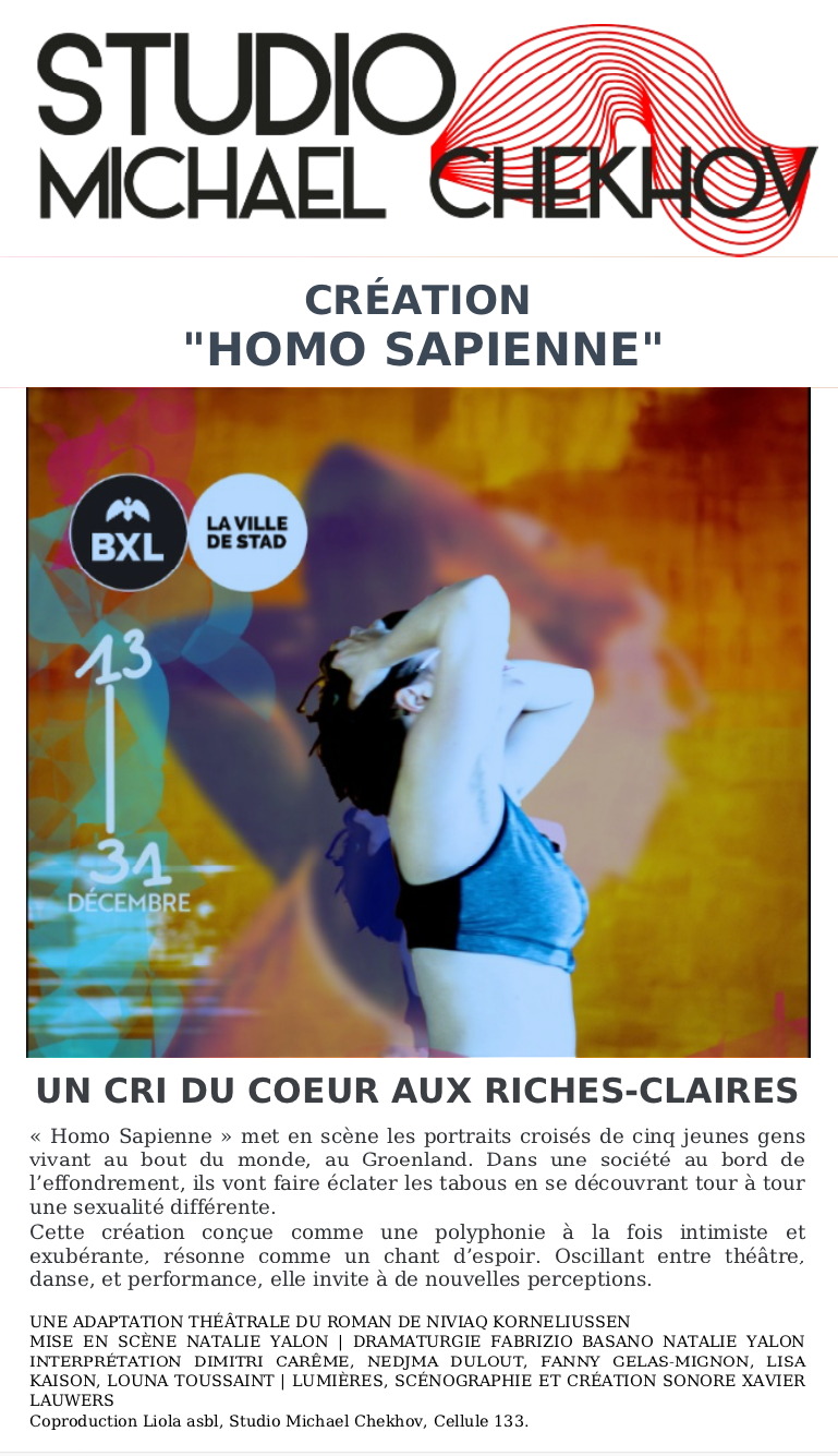 Coproduction Liola Asbl, Studio Michael Chekhov, Cellule 133. Un cri du coeur aux Riches-Claires « Homo Sapienne » met en scène les portraits croisés de cinq jeunes gens vivant au bout du monde, au Groenland. Dans une société au bord de l’effondrement, ils vont faire éclater les tabous en se découvrant tour à tour une sexualité différente. Cette création conçue comme une polyphonie à la fois intimiste et exubérante, résonne comme un chant d’espoir. Oscillant entre théâtre, danse, et performance, elle invite à de nouvelles perceptions. Une adaptation théâtrale du Roman de Niviaq Korneliussen Mise en Scène : Natalie Yalon ; Dramaturgie : Fabrizio Basano, Natalie Yalon ; Interprétation : Dimitri Carême, Nedjma Dulout, Fanny Gelas-Mignon, Lisa Kaison, Louna Toussaint ; Lumières, Scénographie et Création Sonore : Xavier Lauwers. Coproduction Liola Asbl, Studio Michael Chekhov, Cellule 133.