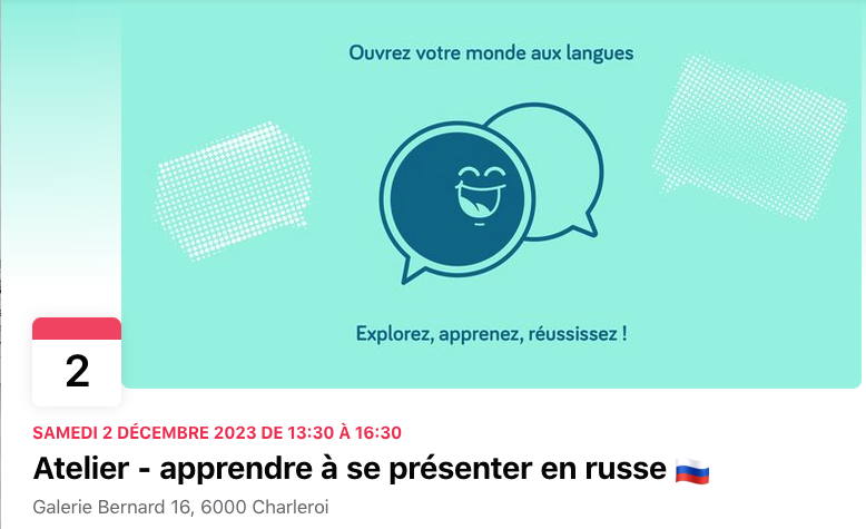 Ouvrez votre monde aux langues : explorez, apprenez, réussisserz Découvrez les bases du russe durant notre workshop de 3 heures Au programme : • l'alphabet - pouvoir écrire et lire son prénom • se présenter - poser des questions et y répondre Le but de cet atelier est de vous donner un avant-goût de la langue et culture russe et de déjà pouvoir vous débrouiller en vous présentant.