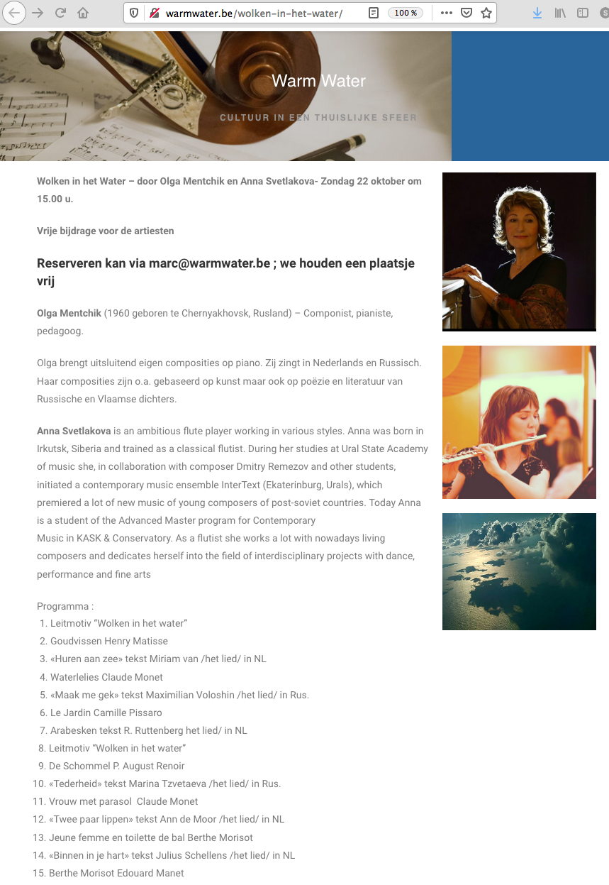 door Olga Mentchik en Anna Svetlakova. Olga Mentchik (1960 geboren te Chernyakhovsk, Rusland) – Componist, pianiste, pedagoog. Olga brengt uitsluitend eigen composities op piano. Zij zingt in Nederlands en Russisch. Haar composities zijn o.a. gebaseerd op kunst maar ook op poëzie en literatuur van Russische en Vlaamse dichters.