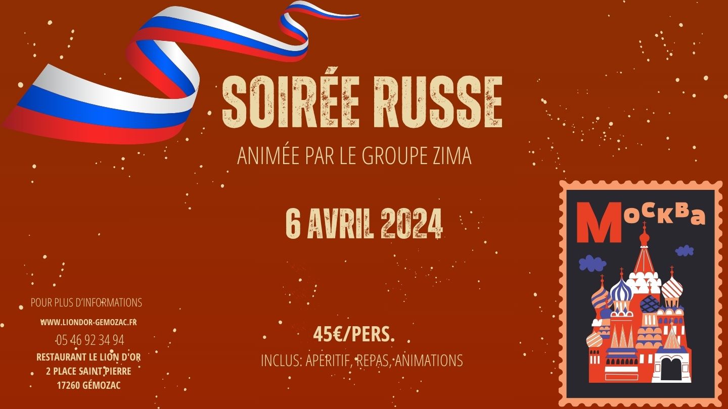Dobrii Den'! Bonjour! Après 3 ans d'absence, elle est de retour - Soirée Russe Au programme : chant, danse, spécialités culinaire, découverte, partage, boissons et animation. La soirée sera animée par le groupe musical « Zima ». Ça y est les réservations pour la soirée Russe sont officiellement ouvertes. On vous attend nombreux, ne tardez pas à réserver Do vskoroi vstretchi!