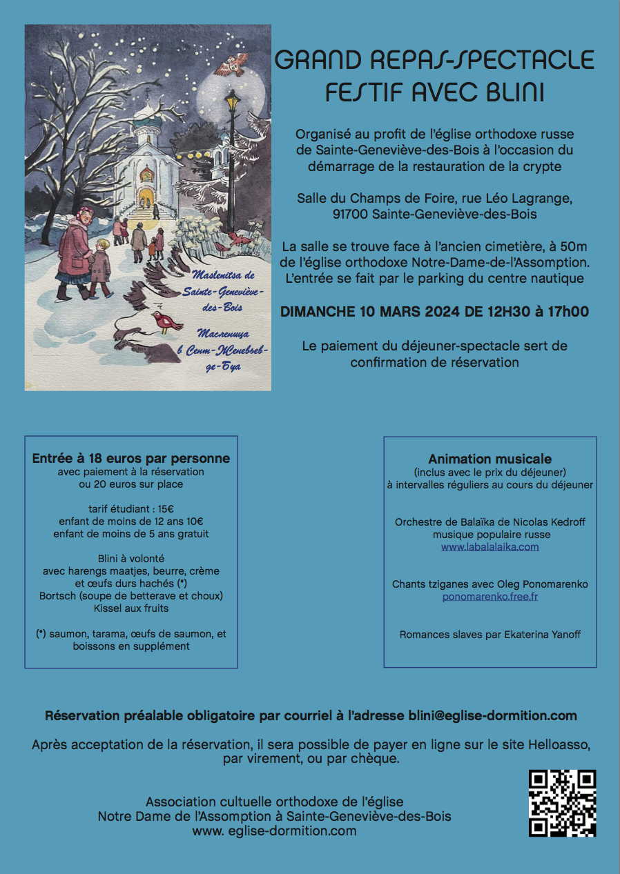 Entrée à 18 euros par personne avec paiement à la réservation ou 20euros sur place (dans la limite des places disponibles). Réservation préalable obligatoire par courriel à l’adresse : blini at eglise-dormition.com