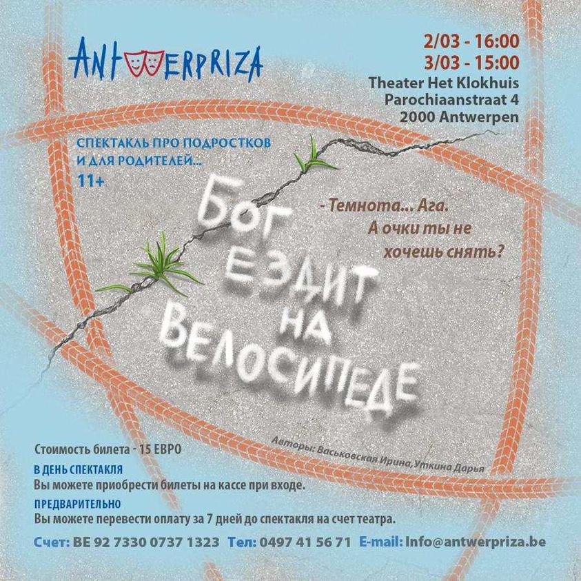 Премьера в Антверпене! Театр « Антверприза »! Приходите с бельгийскими родственниками и друзьями! Субтитры на нидерландский перевели сами юные актеры! « Бог ездит на велосипеде » - парадоксальная фраза, как из компьютерной симуляции, - название новой постановки театра « Антверприза ». Пьес для подростков и о подростках в мировой драматургии, прямо скажем, мало. После успеха спектакля « Чучело » Детская студия вновь взялась за сценарий про тех, кого назвают тинэйджерами (от английского « teen » как части числительного от 13 до 19). Сценарий Васьковской Ирины и Уткиной Дарьи в постановке режиссера Оксаны Король адаптирован под мемы и реалии бельгийских подростков – юные актеры вносят свои коррективы в текст. Но тема «отцов и детей» в ее кульминационный момент – бушующий гормональный возраст с его полетами во сне и наяву, - вечная и захватит интерес мальчишек и девчонок, а также их родителей. Наш режиссер внесла в сценарий собственный « твист », который предстоит угадать зрителям. Смотрите репортаж о брюссельской премьере и ждем Вас в Антверпене!