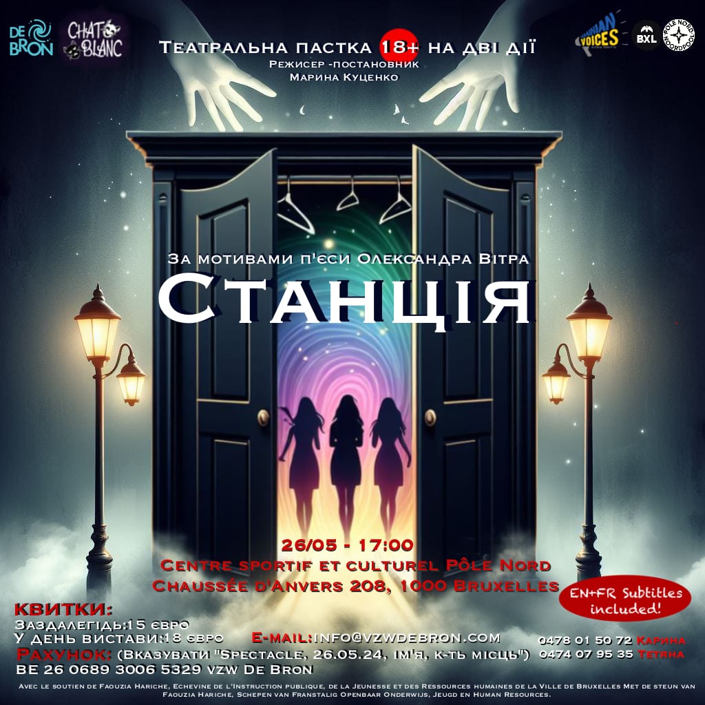 Початок о 16 годині Вартість квитків: 15 євро у день вистави : 18 євро передоплата на рахунок BE 26 0689 3006 5329 vzw De Bron "Spectacle, 26.05.24, прізвище, кількість місць" Довідки та бронювання : info at vzwdebron.com Tél.: 0478 01 50 72 Карина / 0474 07 95 35 Татьяна