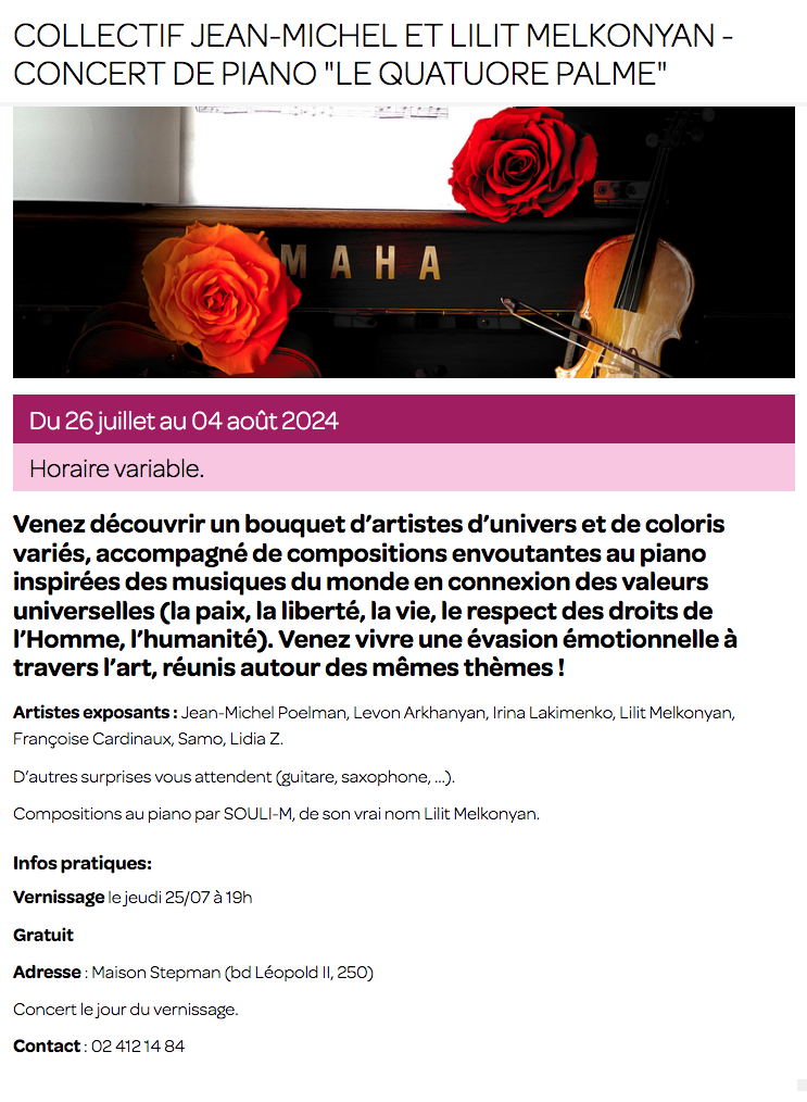 Artistes exposants : Jean-Michel Poelman, Levon Arkhanyan, Irina Lakimenko, Lilit Melkonyan, Françoise Cardinaux, Samo, Lidia Z. Venez découvrir un bouquet d’artistes d’univers et de coloris variés, accompagné de compositions envoutantes au piano inspirées des musiques du monde en connexion des valeurs universelles (la paix, la liberté, la vie, le respect des droits de l’Homme, l’humanité). Venez vivre une évasion émotionnelle à travers l’art, réunis autour des mêmes thèmes ! D’autres surprises vous attendent (guitare, saxophone, ...). Compositions au Piano par SOULI-M, de son vrai nom Lilit Melkonyan. Concert le jour du vernissage.