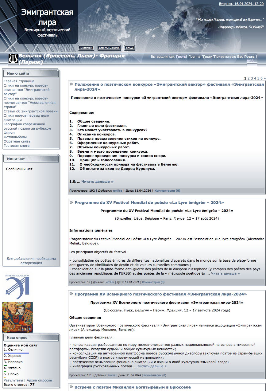 Organisé par Alexandre Melnik, Liège, Belgique XV ВСЕМИРНЫЙ ПОЭТИЧЕСКИЙ ФЕСТИВАЛЬ « ЭМИГРАНТСКАЯ ЛИРА » ПРИГЛАШАЕТ ПОЭТОВ В БЕЛЬГИЮ И ФРАНЦИЮ Опубликованы Программа XV Всемирного поэтического фестиваля « Эмигрантская лира-2024 » (Брюссель, Льеж, Бельгия – Париж, Франция, 12 – 17 августа 2024 года) и Положение о фестивальном поэтическом конкурсе « Эмигрантский вектор ». ССЫЛКИ НАХОДЯТСЯ В ПЕРВЫХ ДВУХ КОММЕНТАРИЯХ. Предлагаются два варианта участия в фестивале – в качестве участника поэтического конкурса « Эмигрантский вектор » (здесь надо прислать конкурсные стихи и выйти в финал; стихи на конкурс принимаются до 1 июня 2024 года) и в качестве внеконкурсного участника фестиваля (для этого надо обратиться к организатору фестиваля Александру Мельнику за разрешением, выдаваемым на основании решения оргкомитета). Все участники смогут читать свои стихи в Брюсселе, Льеже и Париже и участвовать во всех фестивальных мероприятиях. « Эмигрантская лира » – один из лучших современных поэтических фестивалей со стабильно хорошей репутацией. Ключевые слова организаторов – профессионализм, честность, безупречная организация, высокий уровень жюри, порядочность и уважительное отношение к каждому участнику фестиваля. В этом году фестиваль проводится в 15-й раз подряд. Во время пребывания в бельгийском городе Льеж участники принимают участие в местном фольклорном празднике Свободной республики Утремёз (это один из льежских районов) с карнавальным шествием и разнообразными уличными представлениями, на который специально приезжают тысячи людей из разных уголков планеты. Программа фестиваля включает в себя как поэтический конкурс « Эмигрантский вектор », так и большую внеконкурсную программу (музыкально-поэтический вечер « Земля и Лира », вечер разноязычной поэзии « Созвездие лиры », поэтический слэм, презентация литературных журналов, большой поэтический вечер в Париже и т.д.). В ходе мастер-класса « Поэт и редактор » участники могут получить подробный разбор одного из своих стихотворений (как правило, это делается анонимно, хотя чаще всего авторы раскрывают свои имена в конце обсуждения). Основные события фестиваля происходят в самом красивом здании Льежа – дворце Курциуса, расположенном в самом центре города. Вечер разноязычной поэзии « Созвездие Лиры » вводит участников в мир международной поэзии. Стихи на этом вечере звучат на десятках языков. Все они переводятся на русский язык, публикуются в специальном сборнике и проецируются на экране. В фестивале принимают участие как русскоязычные, так и нерусскоязычные поэты из самых разных стран мира. Участникам предлагаются разные варианты размещения в льежских отелях – от самого экономичного (15-20 евро в сутки) до роскошного. Заключительный день проходит в Париже, на территории Свято-Сергиевского богословского института. После завершения поэтического вечера его участникам предлагается бесплатная прогулка по Париже с гидом, после которой проходит совместный ужин в недорогом кафе. После этого можно задержаться на несколько дней в Париже и как следует осмотреть этот великолепный город. В ходе фестиваля организована продажа книг его участников. По традиции, многие участники фестиваля дарят свои книги поэтической библиотеке « Эмигрантской лиры », насчитывающей многие сотни книг. Стихи всех участников фестивал