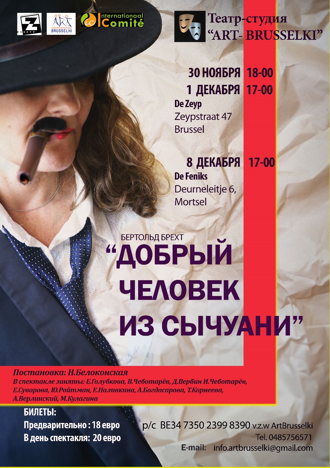 Театр « Art-Brusselki » ПРЕМЬЕРА! Веками боги скитались по земле в поисках доброго человека. И вот, кажется нашли…таковым оказалась Шен Те, проститутка из городка Сычуань. А дальше начинается то, что обычно называется « благими намерениями выстлана дорога в ад». Постановка : Н. Белоконская В спектакле заняты : Е. Голубковка, В. Чеботарёв, Д. Вербин, И. Чеботарёв, Е. Суворова, Ю. Ройтман, Е. Наливкина, А. Богдасарова, Т. Корнеева, А. Верлинский, М. Кулагина