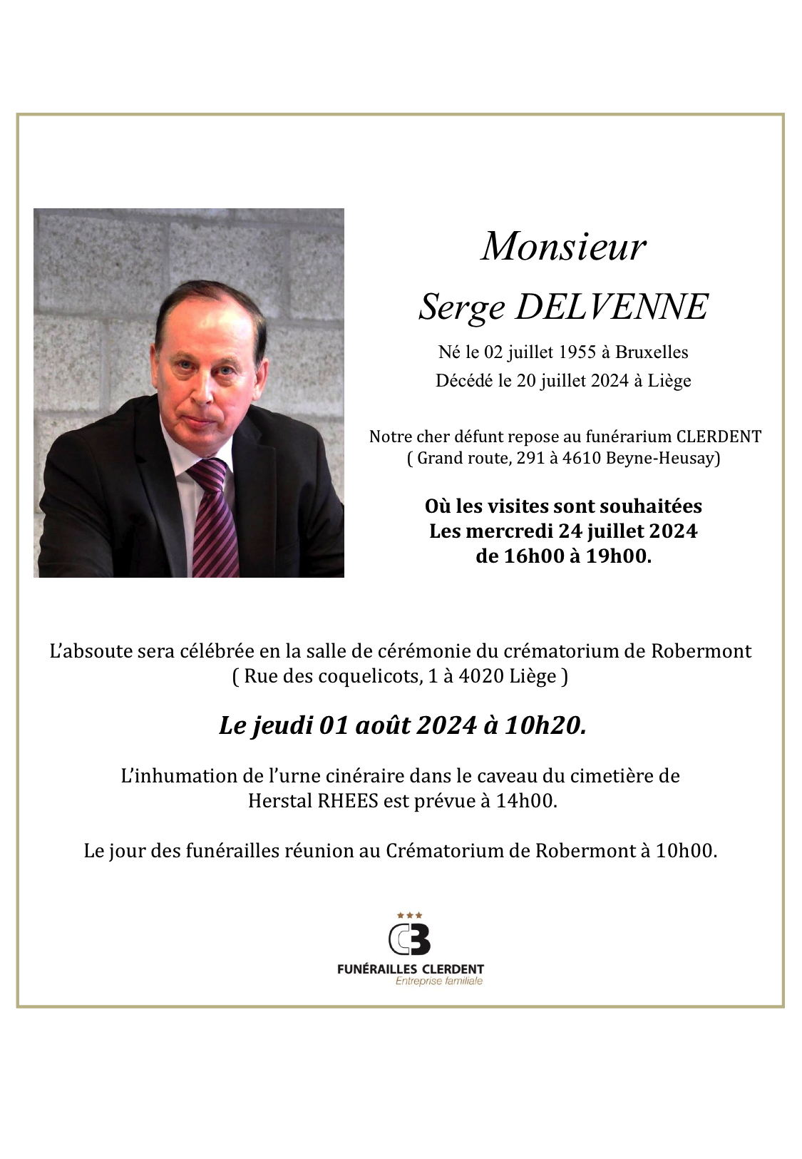 Chers amis, C'est avec une profonde tristesse que nous vous informons du décès de DELVENNE Serge survenu le 20 Juillet 2024.. Ceux qui souhaitent lui rendre hommage ou envoyer les couronnes ou gerbes de fleurs peuvent contacter le pompes funèbres CLERDENT à Grand Route 291, 4610 Beyne-Heusay au 0493 55 15 21 ou se joindre le 24 juillet entre 16h et 19h aux pompes funèbres CLERDENT. La cérémonie funéraire se tiendra le 1er août. L'absoute aura lieu à 10h20 dans la salle de cérémonie du crématorium de Robermont, rue des coquelicots 1, 4020 Liège. L'inhumation dans le caveau du cimetière de Herstal Rhées est prévue à 14h à Rue de Milmort 213, 4040 Herstal. Merci pour votre soutien et votre présence en ces moments difficiles. Avec toute notre gratitude.