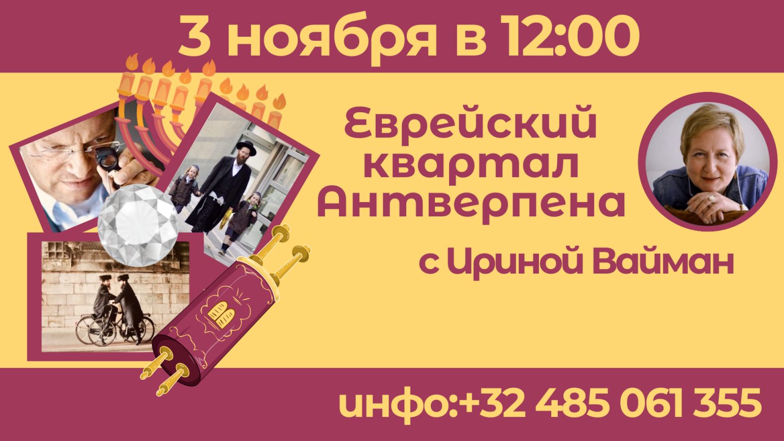 Друзья, по многочисленным просьбам, в воскресенье 3 ноябряв 12:00 у нас состоится экскурсия « Прогулка по еврейскому кварталу с Ириной Вайман » Описание экскурсии : Мы начинаем нашу встречу на вокзале, где узнаем краткую историю еврейской общины в Антверпене. Далее погружаемся в мир бриллиантов: прогуляемся по улице, на которой расположены бриллиантовые биржи и ювелирные мастерские. Затем переходим в еврейский квартал. По пути обсуждаем особенности традиционной одежды ортодоксальных евреев и её символику. Остановимся рядом с еврейским супермаркетом, где поговорим о кошерной еде и о том, как соблюдаются правила кашрута. Пройдём к известной булочной Клейнблатта, обратим внимание на “камни преткновения” — символы памяти жертв Холокоста, и завершим экскурсию у синагоги Роми Гольдмюнца. Посещение синагоги, беседа с представителем общины Мимо памятника Шоа направляемся в ресторан Хоффи на обед. С уважением, Аль-Таир