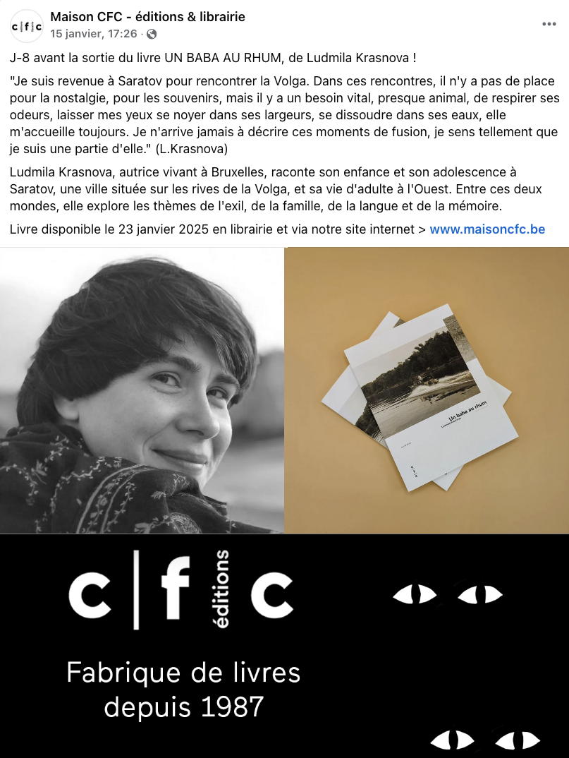 Fabrique de livres depuis 1987 Maison CFC - éditions & librairie Le 15 janvier, 17:26 => J-8 avant la sortie du livre UN BABA AU RHUM, de Ludmila Krasnova ! « Je suis revenue à Saratov pour rencontrer la Volga. Dans ces rencontres, il n'y a pas de place pour la nostalgie, pour les souvenirs, mais il y a un besoin vital, presque animal, de respirer ses odeurs, laisser mes yeux se noyer dans ses largeurs, se dissoudre dans ses eaux, elle m'accueille toujours. Je n'arrive jamais à décrire ces moments de fusion, je sens tellement que je suis une partie d'elle. » (L.Krasnova). Ludmila Krasnova, autrice vivant à Bruxelles, raconte son enfance et son adolescence à Saratov, une ville située sur les rives de la Volga, et sa vie d'adulte à l'Ouest. Entre ces deux mondes, elle explore les thèmes de l'exil, de la famille, de la langue et de la mémoire.