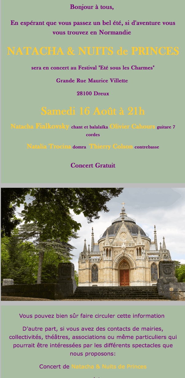 Concert au Festival « Eté sous les Charmes ». Vous pouvez bien sûr faire circuler cette information D'autre part, si vous avez des contacts de mairies, collectivités, théâtres, associations ou même particuliers qui pourrait être intéressées par les différents spectacles que nous proposons : Concert de Natacha & Nuits de Princes ou/et Spectacles - Nuits de Montmartre spectacle musical d'après les textes de Joseph Kessel - Obladi-Obaldia autour des textes et chansons de René de Obaldia n'hésitez pas nous en faire part et de jeter un coup d'oeil sur notre tout nouveau site nuitsdeprinces.com concocté par webcomtoyou Merci, au plaisir de vous revoir! « La flamboyante Natacha Fialkovsky et son trio réchauffent les steppes parisiennes avec leur bohème aristocratique, mélange d'airs tziganes, de berceuses slaves, de swing manouche, traversé parfois de chansons française... » Anne Berthod (ttt Télérama) « ..Une voix magique et une sensualité païenne qui nous transmet, entre une romance de Pouchkine et un air de Fet, ses propres accents, incomparables. Ce sont des arrangements enchanteurs, qui subliment l’union de toutes les cordes : la domra les guitares et la balalaïka. C’est l’Est tsigane et l’Ouest brésilien, le russe des steppes et le français des Balkans ; c’est le traditionnel et le jazz en extase!... » Julie Bouvard