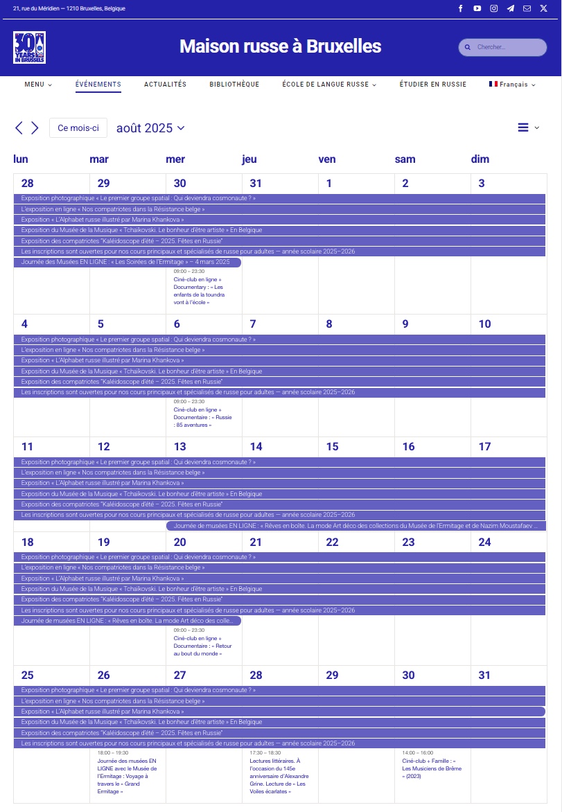 Maison russe Bruxelles-Europe. Calendrier des événements culturels du mois d'août 2025. |