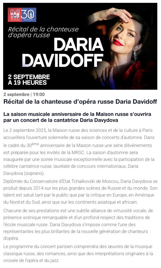 Maison russe des sciences et de la culture à Paris La saison musicale anniversaire de la Maison russe s’ouvrira par un concert de la cantatrice Daria Davydova Le 2 septembre 2025, la Maison russe des sciences et de la culture à Paris accueillera l’ouverture solennelle de sa saison de concerts d’automne. Dans le cadre du 30ème anniversaire de la Maison russe une série d’événements est préparée pour les invités de la MRSC. La saison d’automne sera inaugurée par une soirée musicale exceptionnelle avec la participation de la célèbre cantatrice russe, lauréate de concours internationaux, Daria Davydova (soprano).