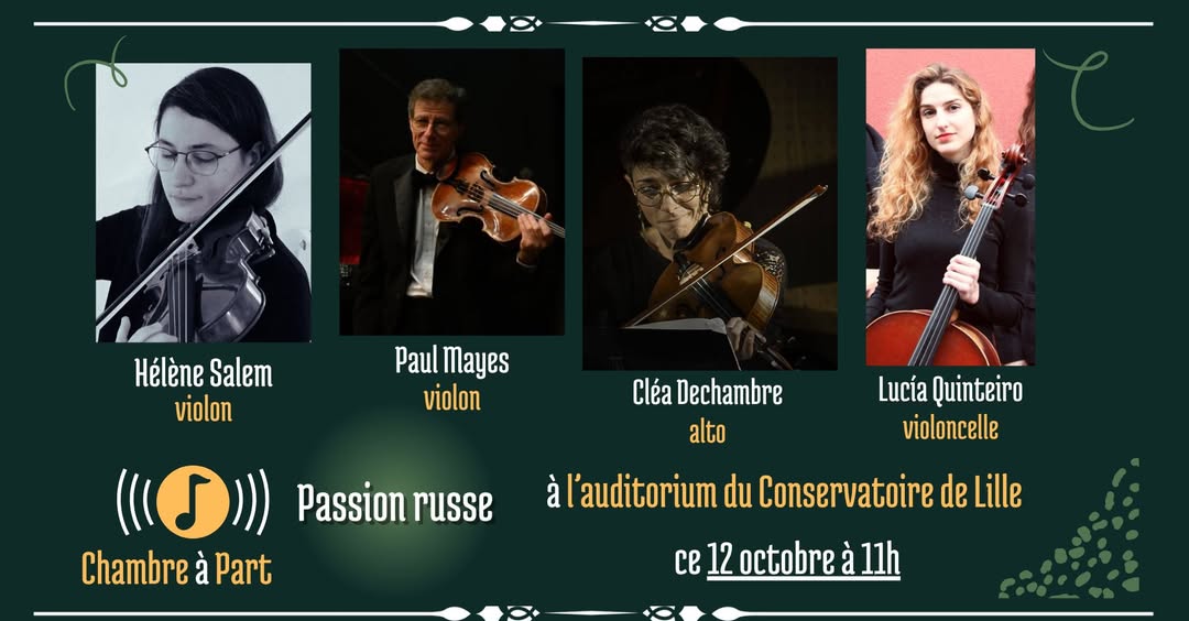 Organisé par « Chambre à Part » Habituellement plus à l’aise avec les couleurs de l’orchestre, ces deux compositeurs russes ont néanmoins produit des petits chefs d’œuvre en musique de chambre. Piotr Tchaikovski : Quatuor à cordes no 1 Reinhold Glière : Quatuor à cordes no 1 - Hélène Salem violon - Paul Mayes violon - Cléa Dechambre alto - Lucía Quinteiro violoncelle