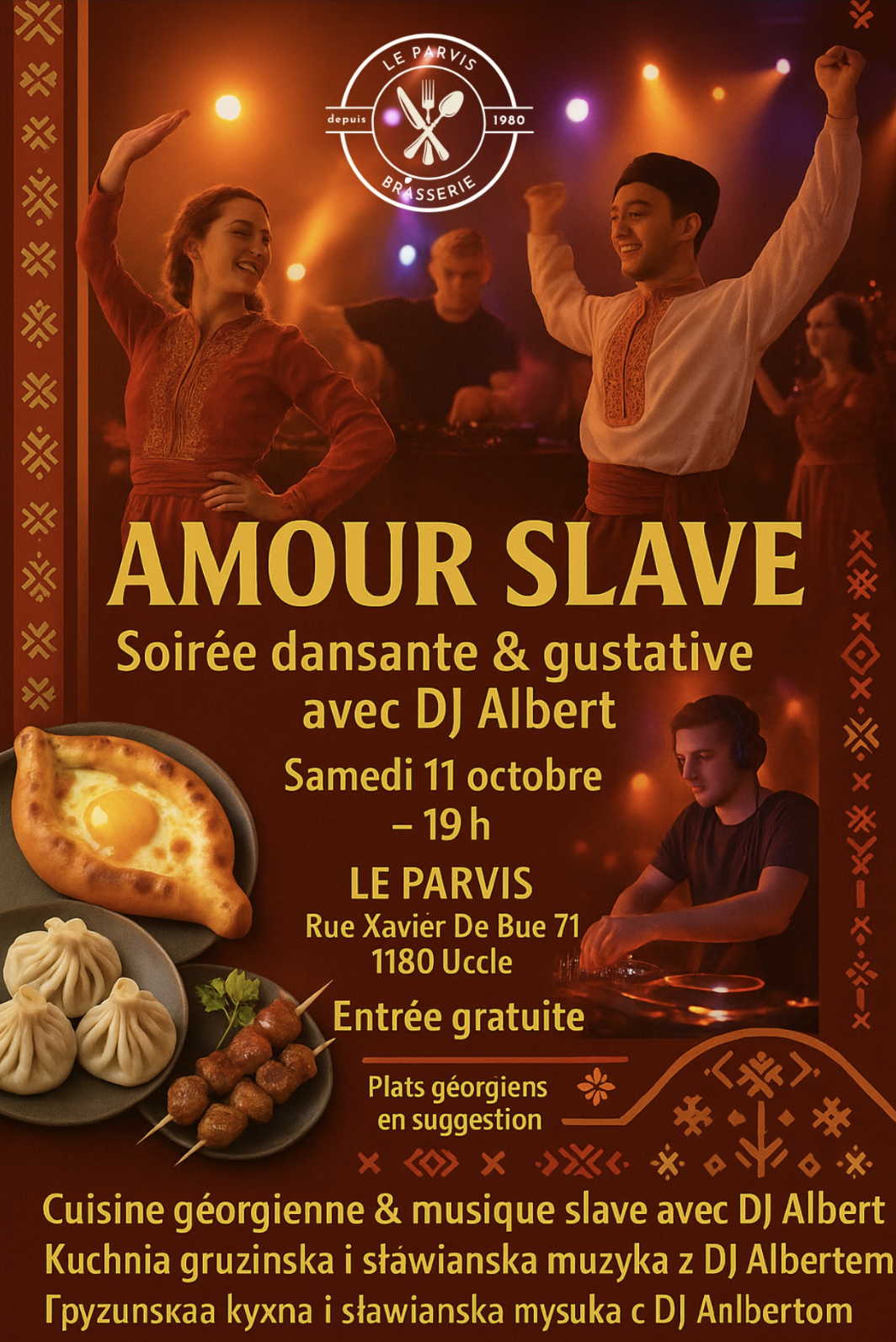 Oyez oyez ! Qu'on se le dise, samedi 11 octobre sera une soirée festive en tous points ! Et c'est au Parvis que ça se passe �� Où, quand, qui, comment ? Au programme : - Soirée dansante avec DJ Albert - Musique slave et ambiance festive - Découverte gustative : plats géorgiens en suggestion