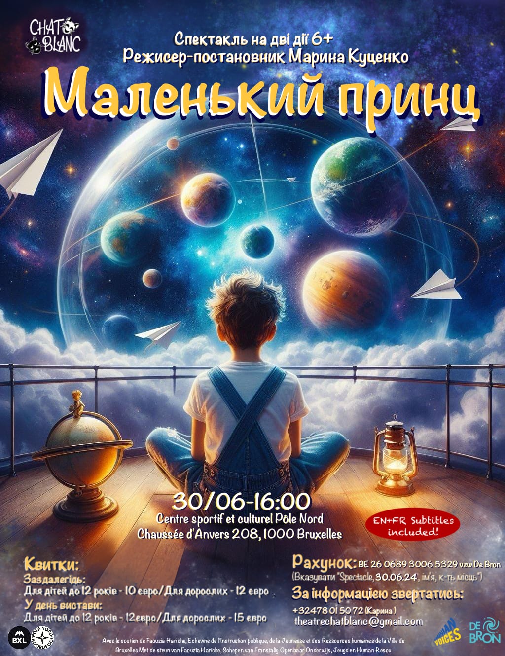 Спектакль на двi дii 6+ / Режисер-постановник Марина Кукценко De Bron vzw / Chat Blanc / EN+FR subtitles included! Шановні друзі, Ми продовжуємо наш театральний сезон. Шкода, що коли ми дорослішаємо, ми забуваємо, що все починається з мрії та твердої віри у здійснення цієї мрії. Дорослими ми забуваємо радіти дрібницям. Ми концентруємось на провалі але зовсім не помічаємо дрібні перемоги. Ми забуваємо, що все, що потрібно нашим близьким, це спілкування та увага. Якщо ви думаєте, що для щастя потрібні мільйони, купа будинків і парк автомобілей, ви шалено помиляєтеся. Ковток води в момент божевільної спраги, малюнок дитини в момент смутку, підтримка близької людини в момент розпачу, краса природи для розслаблення та радості. Це те, що є найціннішим у нашому житті. Маленький принц Екзюпері - це дорослі істини думками дитини. Неперевершену класику на новий лад для вас грає на сцені український театр « Le Chat Blanc » під проводом талановитої режисерки Марини Куценко. Приходьте на нашу виставу та пориньте у світ дитинства та мрій!
