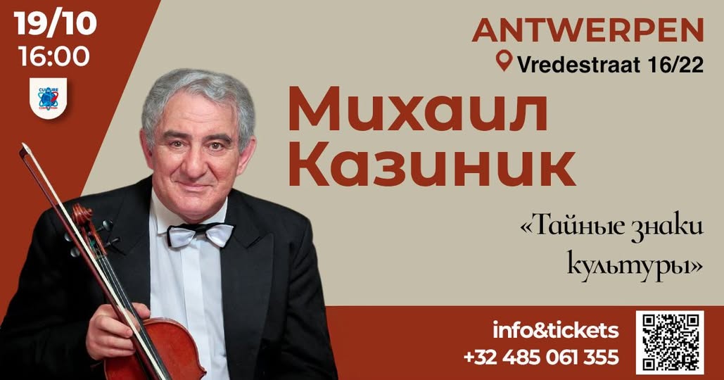 Culture Connection vzw представляет! « Secret Signs of Culture » by Mikhail Kazinik in Antwerp Дамы и господа! К нам едет просветитель и музыковед Михаил Казинник. 19 октября в 16.00 состоится его концерт в Антверпене (Vredestraat 16/22). Следите за рекламой билетов. Михаил Семенович обращается к Вам в видео.