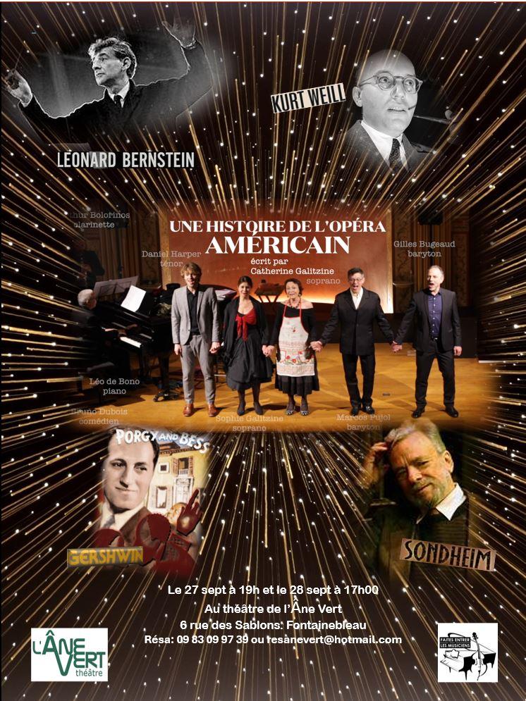 écrit par Catherine Galitzine, soprano Une production de « Faites entrer les musiciens » Chers amis, chers bienfaiteurs, « Une histoire de l'opéra américain » (que vous avez peut être déjà vu en format Lecture-concert) a été réécrit par mes soins sous forme de pièce de théâtre musicale et présenté pour la première fois, cet été, au Festival de l'Ile aux Moines. Nous avons joué et chanté devant 450 spectateurs et d'après les retours du directeur du Festival, Hervé Masquelier, la performance a été saluée à l'unanimité. A présent, je suis fière de vous annoncer que l'aventure continue. « Une histoire de l'opéra américain » va être donné le samedi 27 sept à 19h00 et le dimanche 28 septembre, à 17h00. à Fontainebleau! Notre nouveau spectacle a été sélectionné par Yves-Patrick Grima pour ouvrir la saison du Théâtre de L'Âne Vert, 6 rue des Sablons à Fontainebleau ! Si vous aimez la comédie musicale, ce spectacle est pil-poil pour vous! Venez découvrir comment quatre compositeurs de Broadway , de Georges Gershwin à Stephen Sondheim en passant par Léonard Bernstein et Kurt Weill, ont bousculé les codes et inventé un nouveau style d'opéra, distrayant et accessible à tous! Amicalement, Catherine Galitzine