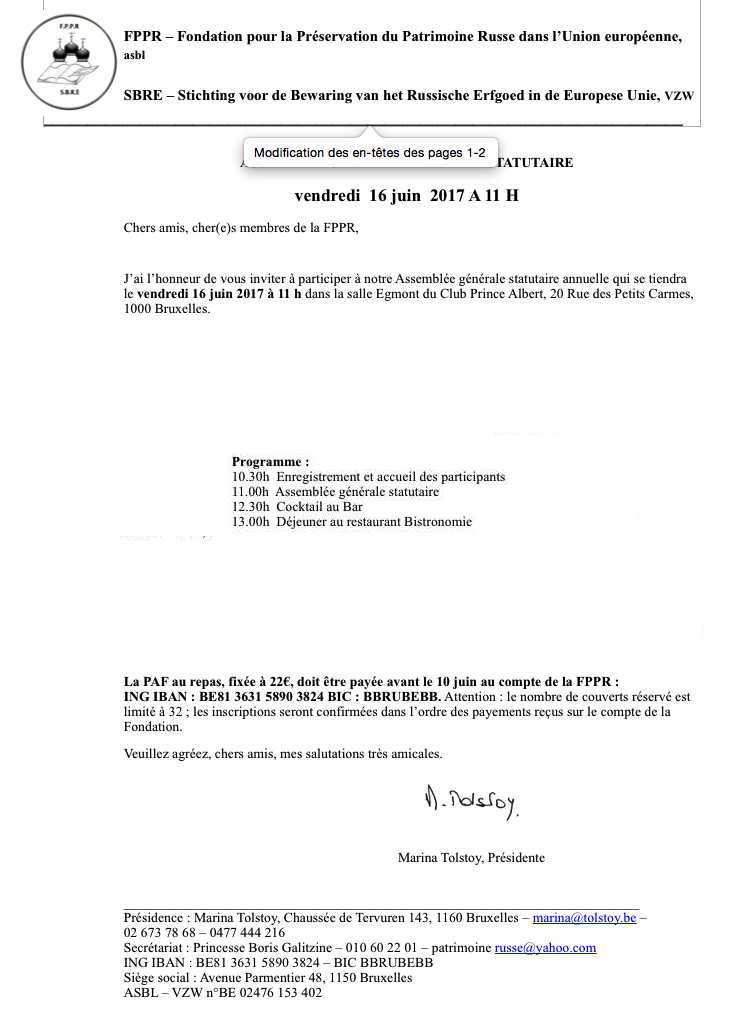 Gratuite pour les membres FPPR 2012 (40 €) mais 15 €+ frais d'envoi pour les non-membres. Siège social : avenue E. Parmentierlaan, 48 - 1150 Bruxelles Présidence : Nicolas Bieliavsky | courriel : nbieliavsky at skynet dot be | tél. : +32 (0)60 39 10 27 Secrétariat : André Schorochoff | courriel : a.schoro at skynet dot be | tél. : +32 (0)2 384 37 40 Banque : ING 310-1446138-51 (IBAN: BE75310144613851 BIC: BBRUBEBB)