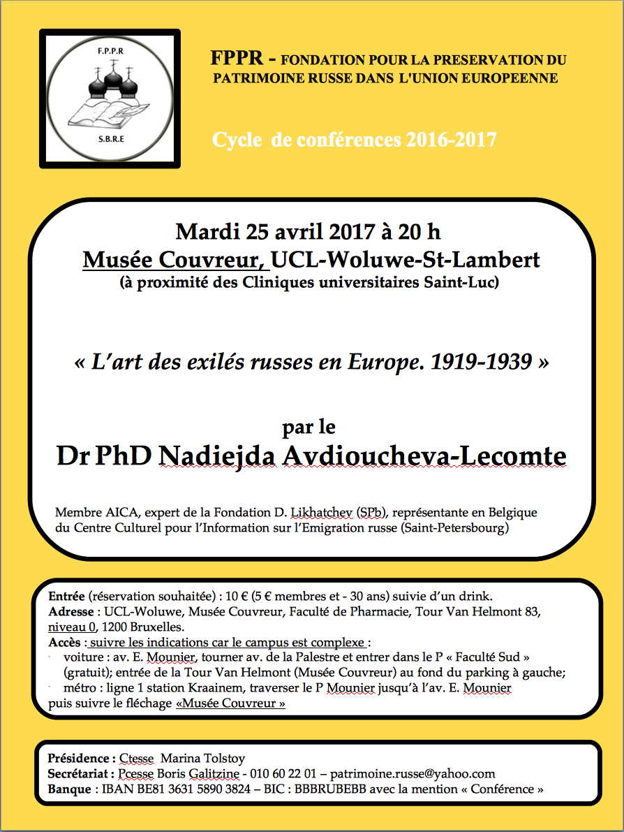 Conférencier : Dr. Nicolas Bieliavsky Président de la Fondation pour la Préservation du Patrimoine Russe en Union Européenne (FPPR en U.E). Conférence organisée par la Société Royale des Amis du Musée de l’Armée (SRAMA) Conférence accompagnée de projection de photos et suivie d'un drink. De 1920 à 1940, suite à la révolution bolchevique, près de 10.000 Russes blancs émigrent de Russie et sont accueillis en Belgique. Le Dr Nicolas Bieliavsky parlera de leur participation à la Résistance anti-allemande pendant la 2ème Guerre Mondiale en Belgique.