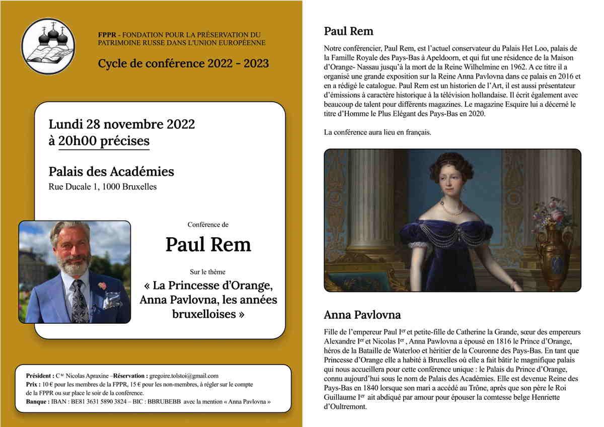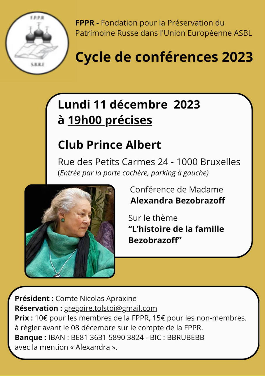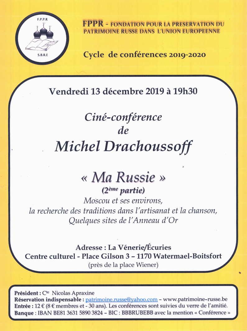 Participation aux frais : conférence, concert et belle assiette russe garnie après le spectacle : 20 € Etudiants : 10 € (gratuit pour les enfants de moins de 10 ans) Réservations souhaitées avant le 7 décembre par virement au compte de la FPPR (Fondation pour la préservation du Patrimoine Russe dans l'Union Européenne) ING 310-1446138-51 avec la mention « 1812 » ainsi que le nombre de personnes.