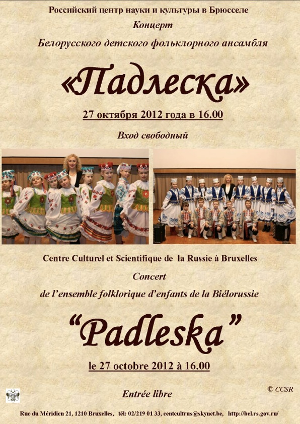 Российский центр науки и культуры в Брюсселе, rue du Méridien 21, 1210 Bruxelles. Téléphone : 02 219 01 33