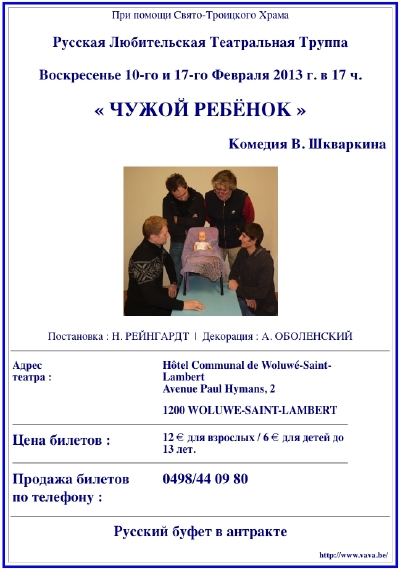 Affiche spectacle « Чужой ребёнок ». Комедия В. Шкваркина. Woluwé Saint-Lambert. 10 et 17 fév. 2013