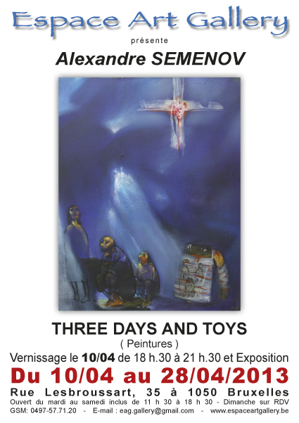 Vernissage le 10/04 de 18h 30 à 21h 30. Trois artistes peintres russes. Renseignements : Jerry Delfosse, Espace Art Gallery, mobile : 0497 57 71 20