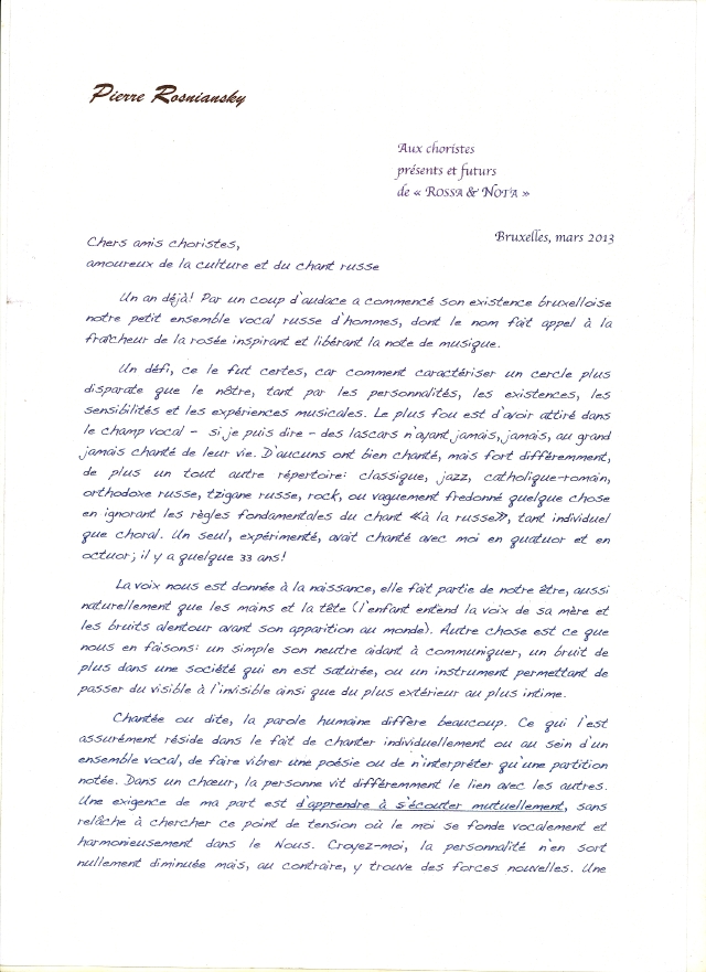 Aux choristes présents et futurs de « Rossa & Nota »Bruxelles, mars 2013 Chers amis chortistes amoureux, de la culture et du chant russe Un an déjà! Par un coup d'audace a commencé son existence bruxelloise notre petit ensemble vocal russe d'hommes, dont le nom fait appel à la fraîcheur de la rosée inspirant et libérant la note de musique. Un défi, ce fut certes, car comment caractériser un cercle plus disparate que le nôtre, tant par les personnalités, les existences, les sensibilités et les expériences musicales. Le plus fou est d'avoir attiré dans le champ vocal - si je puis dire - des lascars n'ayant jamais, jamais, au grand jamais chanté de leur vie. D'aucuns ont bien chanté, mais fort différemment, de plus un tout autre répertoire : classique, jazz, catholique-romain, orthodoxe russe, tsigane russe, rock, ou vaguement fredonné quelque chose en ignorant les règles fondamentales du chant « à la russe », tant individuel que choral. Un seul, expérimenté, avait chanté avec moi en quatuor et en octuor, il y a quelque 33 ans! La voix nous est donnée à la naissance, elle fait partie de notre être, aussi naturellement que les mais et la tête (l'enfant entend la voix de sa mère et les bruits alentour avant son apparition au monde). Autre chose est ce que nous en faisons : un simple son neutre aidant à communiquer, un bruit de plus dans une société qui en est saturée, ou un instrument permettant de passer du visible à l'invisible ainsi que du plus extérieur au plus intime.