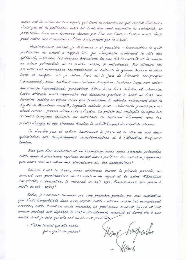 Aux choristes présents et futurs de « Rossa & Nota »Bruxelles, mars 2013 Chers amis chortistes amoureux, de la culture et du chant russe Un an déjà! Par un coup d'audace a commencé son existence bruxelloise notre petit ensemble vocal russe d'hommes, dont le nom fait appel à la fraîcheur de la rosée inspirant et libérant la note de musique. Un défi, ce fut certes, car comment caractériser un cercle plus disparate que le nôtre, tant par les personnalités, les existences, les sensibilités et les expériences musicales. Le plus fou est d'avoir attiré dans le champ vocal - si je puis dire - des lascars n'ayant jamais, jamais, au grand jamais chanté de leur vie. D'aucuns ont bien chanté, mais fort différemment, de plus un tout autre répertoire : classique, jazz, catholique-romain, orthodoxe russe, tsigane russe, rock, ou vaguement fredonné quelque chose en ignorant les règles fondamentales du chant « à la russe », tant individuel que choral. Un seul, expérimenté, avait chanté avec moi en quatuor et en octuor, il y a quelque 33 ans! La voix nous est donnée à la naissance, elle fait partie de notre être, aussi naturellement que les mais et la tête (l'enfant entend la voix de sa mère et les bruits alentour avant son apparition au monde). Autre chose est ce que nous en faisons : un simple son neutre aidant à communiquer, un bruit de plus dans une société qui en est saturée, ou un instrument permettant de passer du visible à l'invisible ainsi que du plus extérieur au plus intime.