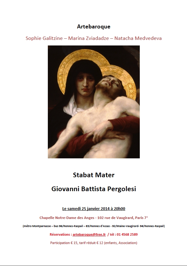 avec Sophie Galitzine, soprano, Marina Zviadadze-Haller, contralto et Natacha Medvedeva, pianiste. Je vous souhaite une merveilleuse année 2014, remplie de bonheur, d'amour, de joie et de musique. A cette occasion, j'ai le plaisir de vous annoncer notre prochain concert : le Stabat Mater de Pergolèse - une production Artebaroque - avec Sophie Galitzine, soprano, Marina Zviadadze-Haller, contralto et Natacha Medvedeva, pianiste. Le concert se déroulera à Paris, samedi 25 janvier 2014, à 20h précises (ouvertures des portes dès 19h15) au 102 rue de Vaugirard, Paris 7° (métro Montparnasse, bus 96-83-92 et 94) à la très belle Chapelle ND-des-Anges. Au plaisir de vous revoir, Cordialement, Natacha Medvedeva