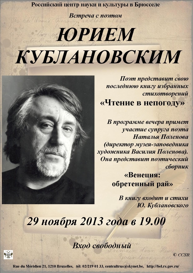 Поэт представит свою последнюю книгу избранных стихотворений « Чтение в непогоду ». В программе вечера примет участие супруга поэта Наталья Поленова (директор музея-заповедника художника Василия Поленова). Она представит поэтический сборник « Венеция : обретенный рай ». В книгу входят и стихи Ю. Кублановского.