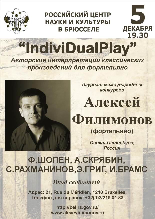 Лауреат международных конкурсов, Санкт-Петербург, Россия. Lauréat de concours internationaux, Saint-Pétersbourg, Russie. Российский Центр Науки и Культуры в Брюсселе. Авторские интерпретации классических произведений для фортепьяно : Ф. Шопен, А. Скрябин, С. Рахманинов, Э. Григ, И. Брамс. Interprétations d'auteur d'œuvres classiques pour piano par Alexey Filimonov : F. Chopin, A. Scriabine, E. Grieg, S. Rachmaninov, J. Brahms.