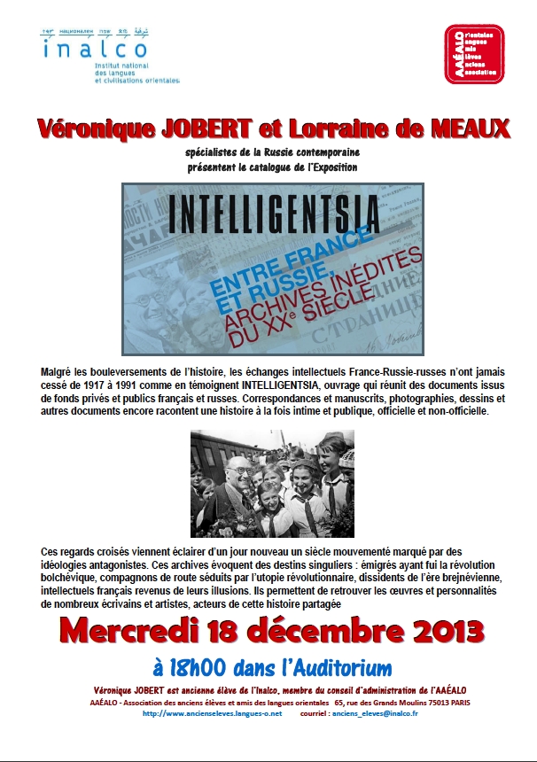 Véronique JOBERT et Lorraine de MEAUX Véronique JOBERT et Lorraine de MEAUX, spécialistes de la Russie contemporaine, présentent le catalogue de l’Exposition Malgré les bouleversements de l’histoire, les échanges intellectuels France-Russie-russes n’ont jamais cessé de 1917 à 1991 comme en témoignent INTELLIGENTSIA, ouvrage qui réunit des documents issus de fonds privés et publics français et russes. Correspondances et manuscrits, photographies, dessins et autres documents encore racontent une histoire à la fois intime et publique, officielle et non-officielle. Ces regards croisés viennent éclairer d’un jour nouveau un siècle mouvementé marqué par des idéologies antagonistes. Ces archives évoquent des destins singuliers : émigrés ayant fui la révolution bolchévique, compagnons de route séduits par l’utopie révolutionnaire, dissidents de l’ère brejnévienne, intellectuels français revenus de leurs illusions. Ils permettent de retrouver les oeuvres et personnalités de nombreux écrivains et artistes, acteurs de cette histoire partagée Véronique JOBERT est ancienne élève de l’Inalco, membre du conseil d’administration de l’AAÉALO