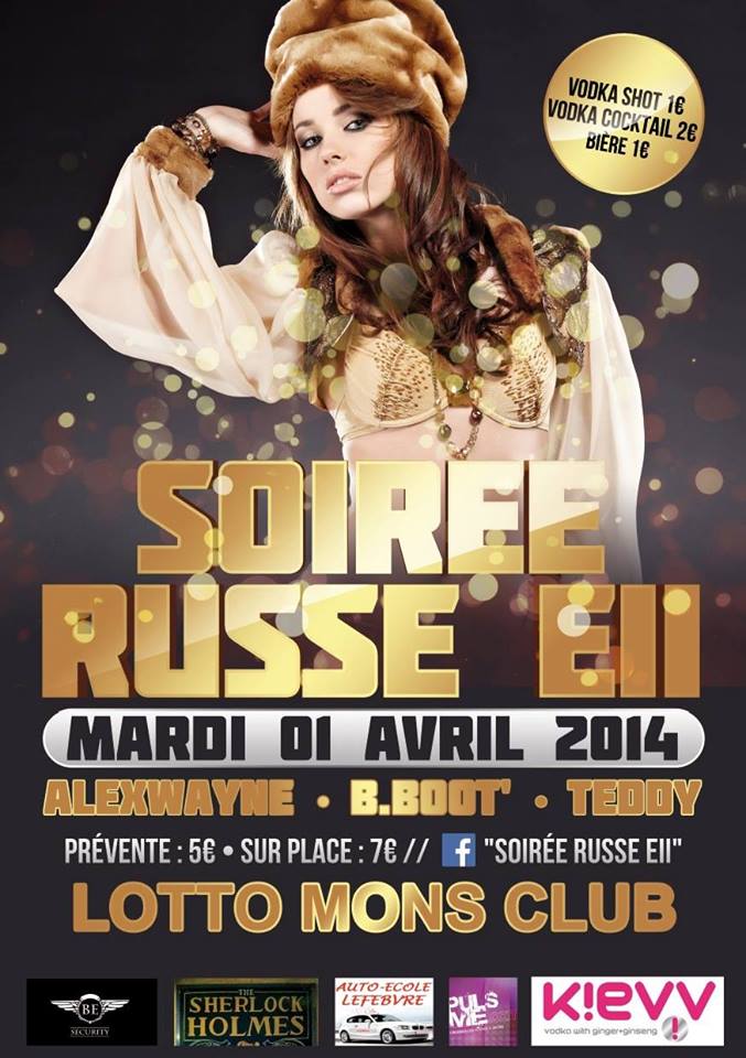 l’E.I.I. prend le contrôle du Lotto Mons Club pour LA plus grosse soirée estudiantine de l’année. De la musique de qualité, de la vodka et plein d'autres choses vous y attendent. DJs : Alex Wayne (Radio Studio One) => B.Boot' (Maes Music Cargo Winner - YES! Party) => http://www.facebook.com/thibault1b?fref=tsTeddy (Escobar) => https://www.facebook.com/pages/Teddy-Djproducer-Photo-Video/289369441102184La Soirée russe, organisée par l'E.I.I., crée un tel engouement que : 900 litres de cocktail sont écoulés pendant la soirée 250 litres de vodka Le Waux-Hall, quand il était accessible, était rempli à chaque fois (plus de 1000 entrées) Drinks : En plus de l’habituel bar à bière (1 €), nous vous proposerons un bar à vodka. Au menu : des cocktails inédits à base de vodka (2 €). De quoi vous faire passer une soirée bien arrosée sans trop causer de tort à votre porte-feuille.