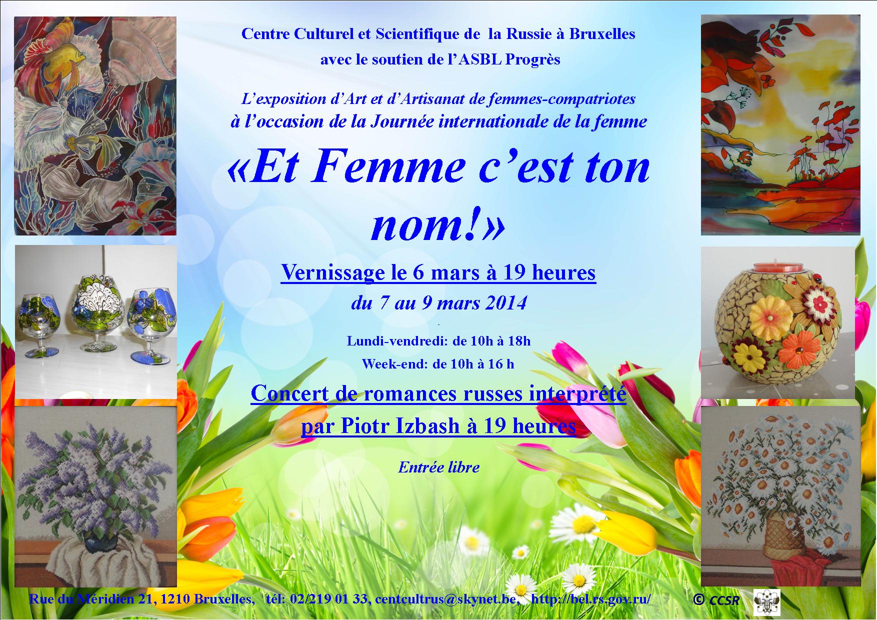 Zinaïda Volkonskaïa. Silhouette d'une gloire immortelle. Зинаида Волконская. Женский силуэт времен бессмертной славы. Exposition d'Art et d'Artisanat de femmes-compatriotes à l'occasion de la Journée internationale de la femme. Vernissage le 6 mars 2014 suivi de concert de romances russes interprété par Piotr Izbach à 19 heures 30'.