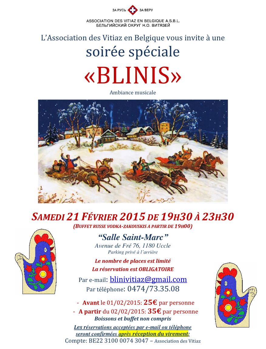 R.S.V.P. avant ce vendredi 30 janvier 2015. Téléphones : +32 (0)4 84 94 26 07 / +32 (0)4 97 61 28 65 / +7 98 59 23 50 31 (Yvan Kriloff) / Courriel : yvan.kriloff at gmail dot com