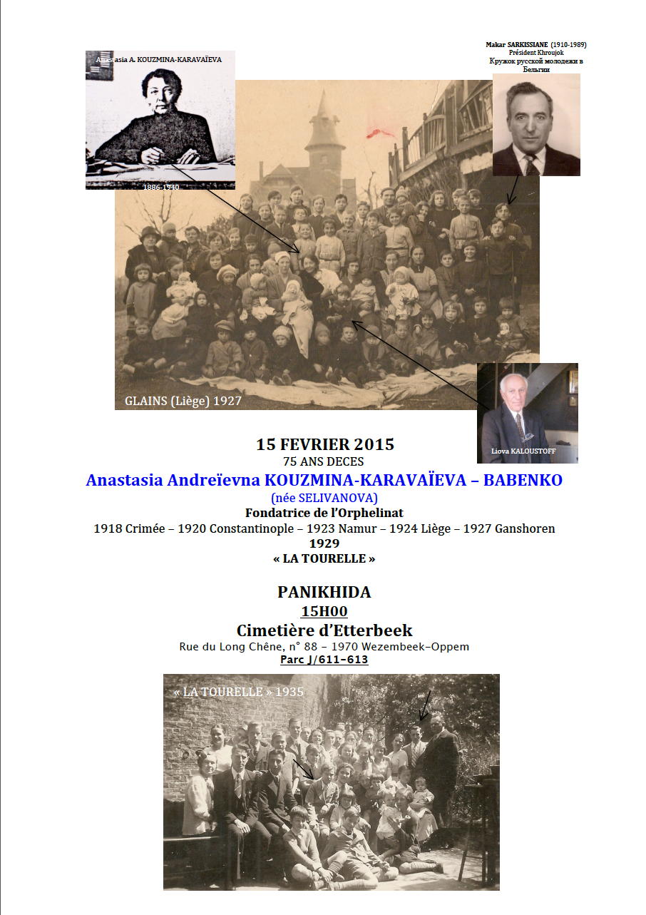 January 2015 : Complément événements et publications.Commémoration du 75ème Anniversaire du décès de Kouzmina Karavaïeva.Aux amis de la paroisse des Saints Panteleimon et Nicolas (De Mot / La Tourelle) La panikhide aura donc lieu au cimetière de 1970 Wezmbeek-Oppem devant la tombe de notre fondatrice, le dimanche 15 février dès 15h00.N’hésitez pas à transférer ce courriel à vos connaissances ayant fait partie des paroisses issues de l’orphelinat de Md Anastasia A. Kouzmina-Karavaïeva. Malgré la présence d’un panneau « sens interdit » à l’entrée du cimetière, nous pouvons nous rendre en voiture jusqu’au « Parc J » (à 600m de l’entrée), il y a un parking prévu pour les visiteurs. Il est utile d’afficher ce plan à côté de l’avis aux valves, afin que les paroissiens puissent se rendre par leurs propres moyens jusqu’aux tombes. A bientôt, Mickey Note : La paroisse St Alexandre Nevsky de Liège (aussi "fondée" par la présence de Mme Kouzmina) s'associera à cette commémoration en participant financièrement à la remise en ordre de la tombe et par une litie des défunts à la fin de la liturgie du 15 février (avec une petite explication préalable). D'autre part, nous publierons une biographie de Mme Kouzmina dans notre prochain bulletin paroissial (sur base d'un texte de père Pavel Nedossekin). pGuy