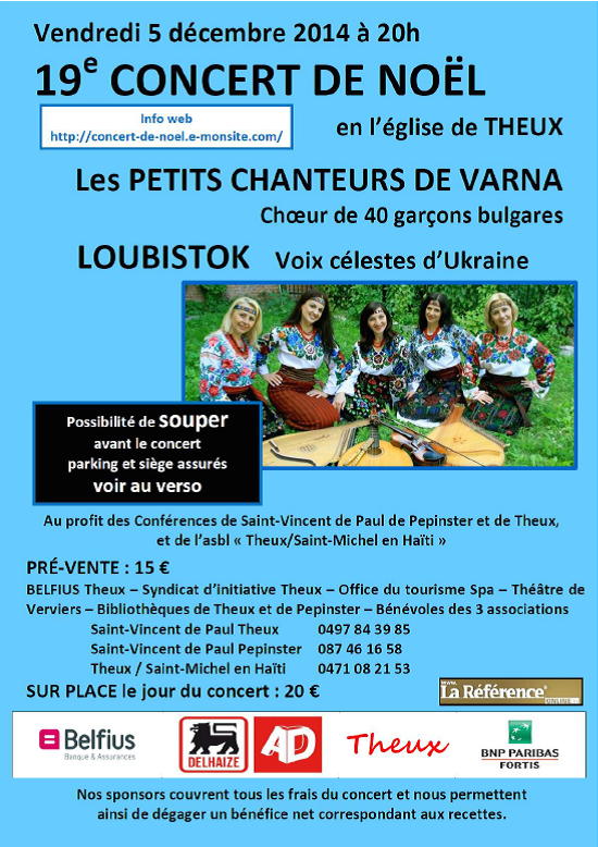 Заказать места можно с 15 декабря по телефону 0483 40 18 89 (Елена). Цена : 65 евро на человека. Рассчётный счёт : BE 210-634498149-03. Заказать места можно по телефону 0487 33 40 68 или по телефону 0496 70 42 57 (Анна).