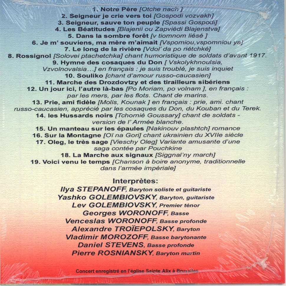 Bonjour à tous ! Certains le savent déjà, nous avons formé un chœur russe d'hommes dans lequel Georges Woronoff, son fils Wenceslas, Sacha Troïepolsky, Yashko et Liona Golembiovski, Ilya Stepanow, Vladimir Morozoff et moi-même nous chantons sous la direction de Pierre Rosniansky. Ce choeur donne enfin un concert à Bruxelles, ce 25 novembre à 20 h à Ste-Alix, à Woluwe-Saint-Pierre. Au programme : de nombreux chants inconnus ou méconnus des armées impériales russes et des armées russes "blanches" qui se sont battues contre les armées dites "rouges" des bolcheviks pendant la guerre civile, entre 1917 et 1921. Nous chanterons aussi quelques beaux chants orthodoxes. Notre chef de choeur quitte la Belgique le lendemain du concert, hélas. Cela veut dire que de futurs concerts seront sans doute assez rares. Pour ceux qui aimeraient nous écouter, voyez l'affiche ci-jointe. Vos amis sont évidemment aussi bienvenus ! Bien amicalement et au plaisir de vous revoir peut-être, Daniel Stevens