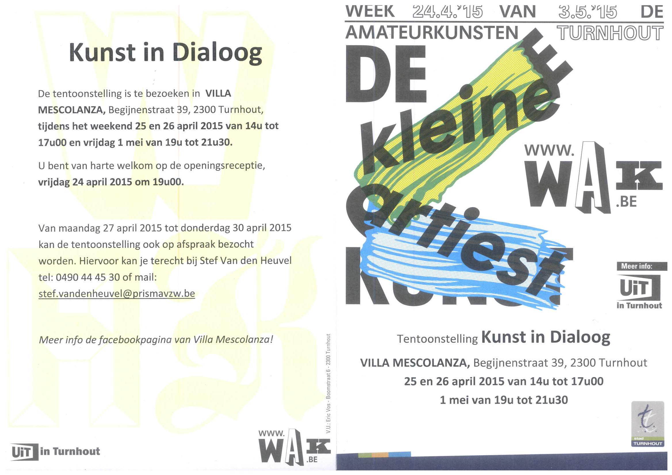 Kunst in dialoog. De tentoonstelling in Villa Mescolanza tijdens het weekend 25 en 26 april 2015 van 14u tot 17uen vrijdag 1 mei van 19u tot 21u30'. U bent van harte welkom op de openingsreceptie, vrijdag 24 april 2015 om 19u00. Van maandag 27 april tot donderdag 30 april 2015 kan de tentoonstelling ook of afspraak bezocht worden. Hiervoor kan je terecht bij Stef Van den Heuvel tel.: 0490 44 45 30 of mail stef.vandenheuvel at prismavzw dot be